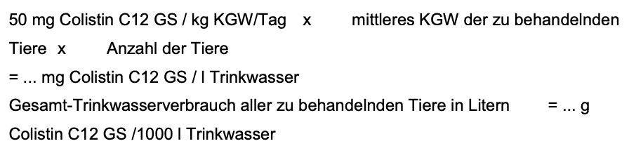Beim Huhn ist die Dosierung am aktuellen, tatsächlichen täglichen Trinkwasserbedarf der Tiere auszurichten, da dieser in Abhängigkeit von Alter, Gesundheitszustand und Nutzungsart der Tiere und in Abhängigkeit von der Haltung (z. B. unterschiedliche Umgebungstemperatur, unterschiedliches Fütterungsregime) schwankt. Bei der oben genannten Dosierung ist das Einmischverhältnis von Colistin C12 GS in Trinkwasser für die zu behandelnden Tiere nach folgender Formel zu berechnen: