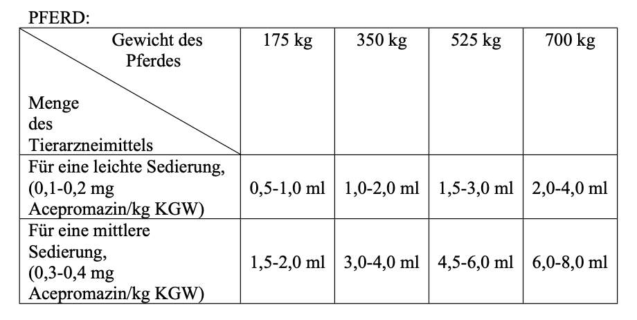 Die oben angeführte Dosierung gilt als Richtlinie und sollte auf jeden Patienten und Einbeziehung der verschiedenen Faktoren (z.B. Temperament, Rasse, Nervosität etc. ), die die Sedierung beeinflussen können, angepasst werden.