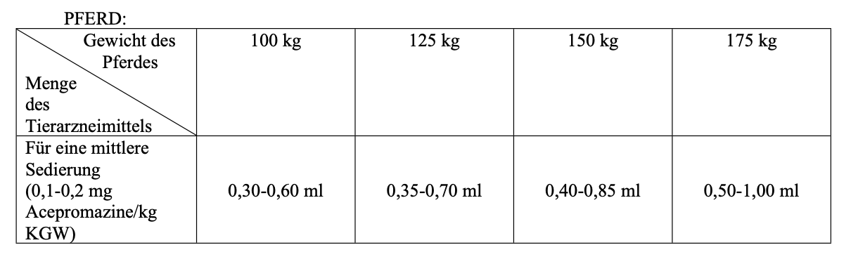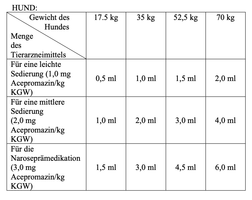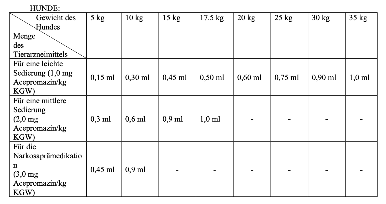 Für eine Prämedikation ist die gleiche Dosierung wie für eine Sedierung anzuwenden. Nach der Verabreichung von Acepromazin ist die notwendige Menge des Anästhetikums zur